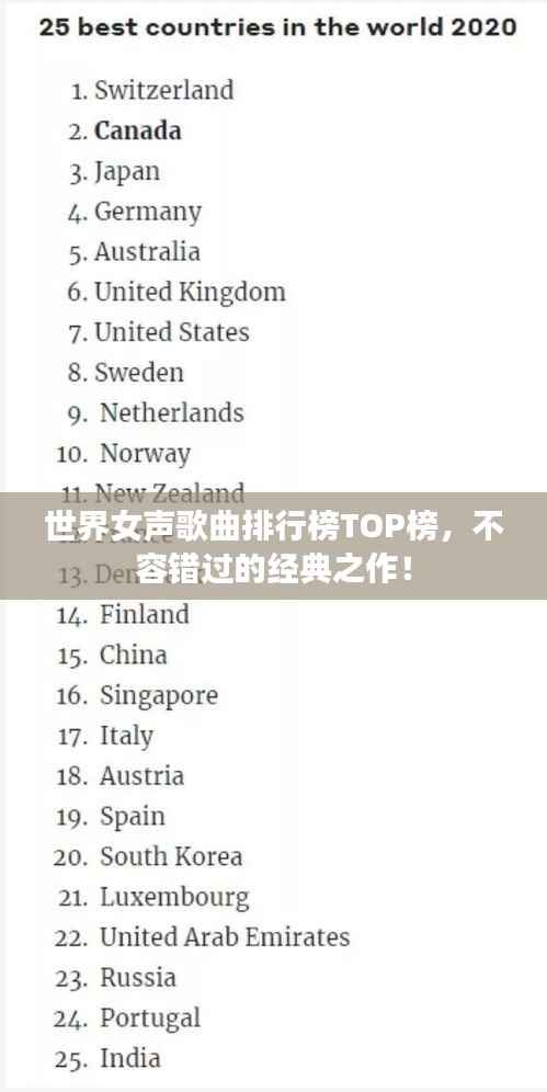 是世界着名女声歌曲的排名,这些歌曲各具特色,代表了女声音乐的不同流派和风格,它们以其优美的旋律和深情的演唱,触动了人们的内心,成为了全球公认的经典之作。